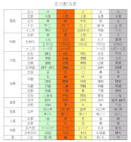 この五行は森羅万象の象徴、すべての要素・元素の基準となる。その中の代表的なものが「五行配当表」。